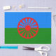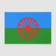 Esta design apresenta a bandeira romani, que é a bandeira internacional das pessoas romanichéis. A bandeira é constituída por um fundo azul e verde, representando os céus e a terra, respectivamente; contém também uma chacra vermelha de 16 raios, ou uma cartela, no centro, que representa a tradição itinerante das pessoas romanichéis e é também uma homenagem à bandeira da Índia. A bandeira foi aprovada pelos representantes de várias comunidades romanichéis no primeiro Congresso Mundial Romani (WRC), realizado em Orpington em 1971.