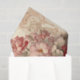 Um conjunto de grandes rosas cor-de-rosa e outras flores com um vaso ornamentado e papel de tecido de estrutura.