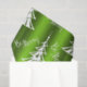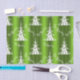 Um Livro Verde colorido de Natal, com um moderno padrão natalício de árvores brancas de abeto e as palavras "Seja Feliz" espalhadas à sua volta, tudo num fundo verde brilhante e festivo.