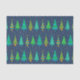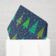 A modern geometric pattern of fir trees in teal, turquoise and golden yellow. The sky is navy with white falling snow.