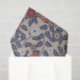 Seamless floral pattern featuring stylized dark blue leaves and multi-colored flowers in muted terracotta, gray, and white against a beige background.