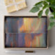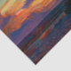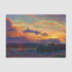 Um design de arte de um belo pôr do sol também mostrando rochas, praia e um homem pescando.
