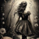 Sob um céu drenado de cor, Alice caminha através de uma Terra Maravilha fantasma, feita em tons de cinza, branco e sépia. Rastreando galhos e arbustos empobrecendo seu caminho, suas sombras se esticando como dedos esqueletais. Cogumelos vermelhos, o único indício de cor, pontam a trilha assombrada, seu brilho estranho lançando uma aura de outro mundo. O ar é grosso com sussurros de contos esquecidos, como se a própria paisagem respirasse com os ecos dos mistérios das Terras Maravilhas