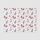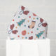 Papel de seda temático de Natal com um padrão repetido de árvores de Natal verdes, luvas de lã quentes, meias de Natal fofas e bolas vermelhas em um fundo branco.