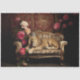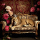 Em meio à opulência de uma era passada, um leão comum reclina sobre um sofá antigo adornado com delicados florais cor-de-rosa. As paredes vermelhas profundas do damasco envolvem a cena num sentido de luxo eterno, enquanto uma coroa ouro repousa sobre a cabeça dos animais um testamento silencioso ao seu nobre reinado. Neste momento de reposição, poder e elegância se entrelaçam, capturando a essência de uma régua em repouso. Perfeito para arte ou mobiliário.