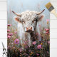 Esta pintura captura uma majestosa vaca branca Highland em um campo de flores vibrantes, criando uma cena serena e pastoral. O ligeiro contraste entre o casaco fluffy da vaca e as flores coloridas evoca uma sensação de tranquilidade e de encanto rústico.