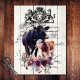 Bela vaca angus e seu bezerro atrás de um buquê floral roxo. País francês, vintage, vitoriano, cartazes em um fundo de conselho de madeira vestido, branco. Perfeito para uma vibe rústica de fazenda ou fazendo artesanatos de dissociação.