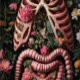 Uma fusão impressionante de nervuras esqueléticas interligadas com raízes e vinhas enredadas, simbolizando o crescimento da vida a partir de dentro. Os florais escuros emergem dos espaços vazios do corpo, misturando a morte e o renascimento em um contraste estranho mas cativante. A paleta é rica com pintas, verduras profundas, e carvão de cinza, evocando a essência da natureza recuperando o corpo