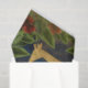 Flores vermelhas, folhas verdes e uma girafa sobre um fundo azul escuro.