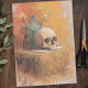 Este moody lenço de Halloween apresenta um crânio de inspiração vintage que repousa contra o feno com garrafas de vidro velhas e sotaques florais suaves. O fundo cor de laranja quente do ouro cria um brilho rústico e estranho que parece tanto gótico quanto eterno. Este é um design de página de cheio, perfeito para embrulho de presentes, artesanato de Halloween, desacoplamento ou projetos de jornalismo de lixo.