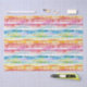 Saco de tecido de presente de aniversário num estilo branco e colorido de listras de cor d'água em vermelho, laranja, amarelo, roxo e azul.