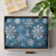 Destei's lovely white snowflake pattern over an abstract blue background creating a chilly winter look. Perfect for holiday gifting, winter birthdays or any seasonal celebration.