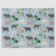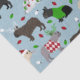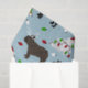 Cachorros Franceses Bonitos vestidos em roupas festivas de férias, chapéus de Santa e blusas de argila com Enfeites de natal dispersos em fundo azul.