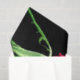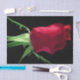 Papel tecidular com imagem de um botão de rosa vermelha contra um fundo preto.