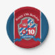 Meninos tricotam escudo medieval festa de aniversário pratos de papel descartáveis. Personalize com o nome e a idade dos seus aniversários. Lê Feliz 10º aniversário Benjamin. Ideal para cavaleiros infantis e festas de aniversário de donzelas. Corresponde a outros itens no escudo do cavaleiro, azul, vermelho e cinza. Arte original e design por Sarah Trett. www.sarahtrett.com para www.mylittleeden.com