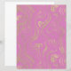 Possui um design dourado abstrato marmoreado em um fundo rosa.