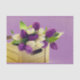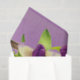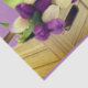 Papel tecidular com imagem de tulipas roxas e brancas contra fundo de lavanda numa caixa de madeira.