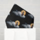Um gato olha de uma nuvem em frente a um grande papel de tecido lua de cheio.