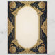 Flores e folhas Douradas sobre fundo preto e verde criam uma bela e ornamentado armação para esta papelaria. O verso é simples, numa sombra complementar à frente. Clássico e elegante, perfeito para correspondência, folhetos e convites.