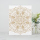 Na moda, de ouro Whimsical mandala mehndi florly trabalho de arte, design floral de henna indiana com um círculo geométrico de flores e formas de penas, linhas, listras, triângulos e imagens de pontos, sobre fundo branco sólido. Esta design de efeito de textura metálica dourada, asteca, tradicional com uma reviravolta moderna, mística, decorativa, desenhada à mão, nativa, ilustração étnica motif, chique boho, sonho feminino de sentir trabalho de arte, é perfeita para o visto diário, decoração caseira, celebrações e decorações temáticas de dias especiais.