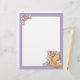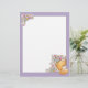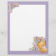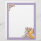 Cabeçalho fofo com urso de pelúcia e flores com moldura roxa. Faz um convite simpático para chá de bebê, bem como papel para escrever.