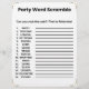Pense rápido e desembarace a diversão! Esta Palavra do Partido é o jogo imprimível perfeito para aniversários, noites de jogos, festas de família ou eventos de equipes. Desafie seus convidados para quebrar o código e ser o primeiro a terminar. É uma maneira simples, mas super engajante de fazer todos rindo e competindo! ✔️ US Letter Size (8,5x11") ✔️ Inclui 16 palavras embaralhadas relacionadas ✔️ chave de resposta incluída (opcional) ✔️ Transferência instantânea - sem espera!