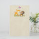 Papel de papelaria com uma ilustração fofinha com veado bebê e um pequeno esquilo segurando uma bolota e uma borboleta voando sobre suas cabeças. Estas adoráveis criaturas de floresta em pé sobre uma grama com alguns cogumelos brancos perto de seus pés. Fundo é uma imagem de pergaminho/papel kraft, falso não real.