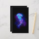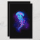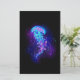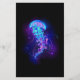 Água-viva grande, azul, desenhada artisticamente, brilhante, brilhante, com longos tentáculos sobre fundo preto com bioluminescência roxa. Água-viva luminosa.