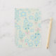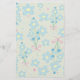 Uma mistura harmoniosa de flores azuis macios com centros amarelos pálidos, amarrados com arcos cor-de-rosa doces, arranjados em tamanhos variados. Os delicados buquês estão lindamente entremeados sobre um fundo suave, pastel e amarelo-esverdeado, irradiando um sentimento de calma e doce simplicidade.