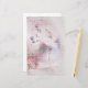 Ballerina dançando a um pé vestindo uma rosa claro. Pequenas flores roxas e leves em diferentes tamanhos espalham-se atrás da bailarina. Pia rosa no canto inferior esquerdo. Fundo de cor d'água roxa e cor d'água roxa e papel branco revestido e papel de escrevendo.