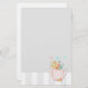 Papel de carta com ilustração química. Um bule cor-de-rosa com um pequeno coração cor-de-rosa no centro e um buquê de flores. Delicar borboletas coloridas com sabor a flecha.