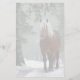 Papel de papelaria com fotografia de um cavalo marrom com um mane branco esfregado longo. Em pé em uma floresta com flocos de neve caindo por toda parte.