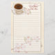 Seja a sua preferência por café ou chá, esta papelaria é a superfície escrevendo perfeita para as suas notas, letras e noções. Xícara de café desenhada por vetor com flores de cereja ao fundo.