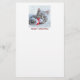 Papel de papelaria com uma bela fotografia de Natal de uma cinza de gato a morder um chapéu vermelho de santa. Suas grandes patas fofinhas tornam esta foto muito encantadora. Por baixo da foto está o texto: Feliz Natal.