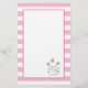 Papel de carta com fundo listrado cor-de-rosa e branco. Um quadro branco com uma borda cor-de-rosa colocada sobre cima para você gravar dentro. Dentro na moldura uma ilustração de uma mãe e um coelhinho de bebê juntos. Águas amarelas no fundo. Borboletas brancas se espalhando.