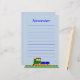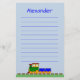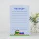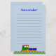 Na parte inferior desta papelaria, um trem giro está na linha de trem. O papel azul claro também tem texto de exibição azul escuro no topo para o nome do garoto. Você pode editar o texto preto para mostrar o nome da criança.
