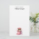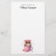 Papel de carta com uma imagem adorável de uma coruja sentada numa caneca de café. Corações pairando e um rosa solteiro colocado no fundo da xícara.