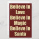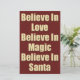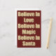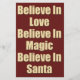 Um bom Natal dizendo sobre Papai Noel em creme e texto vermelho escuro com flocos de neve e um fundo vermelho de papel. Acredite no amor, acredite em magia, acredite em Papais noeis.