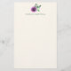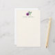Papel de papelaria elegante apresenta uma flor pansy roxa e sotaques botânicos verdes em bonito aquarelas, sobre fundo de nódoas.