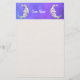 Esta papelaria é branca, com uma borda do céu roxo no topo, com duas luas brancas de crescente, com decorações em estrelas amarelas, roxas e azuis e douradas, juntamente com rostos. Personalize seu nome ou texto com o modelo.