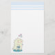 Papelaria com um dinossauro sorridente, bochechas rosadas cor-de-rosa e RAWR escrito em sua barriga. 3 estrelas felizes coloridas acima de sua cabeça. A borda superior tem um padrão azul claro e branco de bolinhas e faixas.