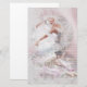 Duas belas bailarinas, uma em um cisne branco como uma fantasia em uma pose saltando, a outra em baixo se curvou em uma pose esticada. "Dança" escrita em uma faixa rosa. Papel branco revestido e papel de escrevendo.