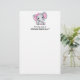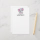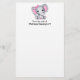 Papel de papelaria com uma ilustração de aquarela de elefante rosa e giro. Ela tem orelhas bonitinhas, cor-de-rosa e bolinhas branca e arco bonito de fita rosa sobre a cabeça.