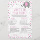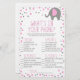 Este é um Elefante Rosa e Cinza intitulado O que há no seu jogo de Chá de fraldas telefônico. *O que há no seu telefone? - Os convidados obterão pontos para cada item que tiverem no telefone. Quem ganha mais pontos, ganha! O design consiste de um elefante de cinza rosa com bolinhas. chá de fraldas animal de zoológico, chá de fraldas de animais, chá de fraldas de cinta rosa, chá de fraldas para menina, itens em telefone, jogos de palpite, atividade de chá de fraldas, atividades de chá de fraldas