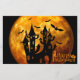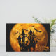 Esta design apresenta uma saudação feliz do Dia das Bruxas com uma imagem de lua de cheio iluminada em um tom assustador de laranja brilhante. Você também pode ver uma casa assombrada e morcegos voando no ar. Ao lado do texto estão duas pequenas imagens: uma de gato e outra de abóbora, ambas associadas ao Halloween.