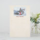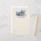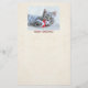 Papel de papelaria com uma foto de Natal fofa de um gato cinza listrado mordendo brincando um chapéu de Papai Noel vermelho.