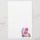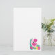 Papel de carta com uma ilustração fofinha de um flamingo cor-de-rosa com algumas melancias e abacaxis. Esquema de cor rosa e verde. Sumério e tropical.