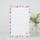 Papel de papelaria revestido, brilhante e colorido, decorado com pequenas borboletas azuis e flores rosadas brilhantes pintadas a aquarelas num fundo branco nítido.