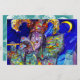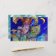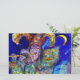 A pintura colorida, lunática e vibrante da aguarela em vermelho brilhante, azul, verde, amarelo do ouro, rosa, cores fúcsia inspirou do carnaval do dell'Arte de Veneza e de Commedia. Um jogador de flauta expressivo na noite, na luz de lua e em um gato azul. Este design legal e artístico é igualmente um presente bonito para ocasiões especiais, aniversários, casamentos, Natal, feriado, carnaval, estação do carnaval.