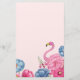 Flores exóticas, cor-de-rosa e azul, com flamingo.